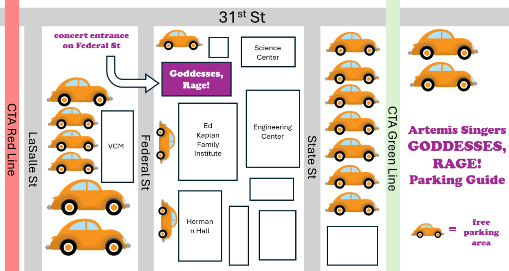 If you are driving (preferably carpooling), the address for your map app is 3125 S. Federal St (there are several buildings for VanderCook College of Music — this is the one you want). This is an Accessible entrance. See the free parking areas indicated below. Please note that payment is not required at the time of the concert, even though you may see signage indicating otherwise.