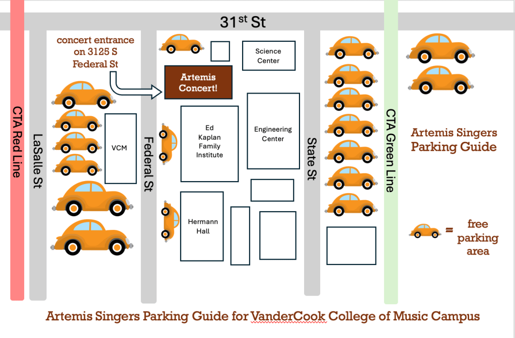If you plan to drive, here’s a map of where you can park free of charge. Signage may say you have to pay a fee, but the evening of our concert you can park free. You can also ride share, car pool, or take the CTA Red Line 35th Sox station (142 W. 35th St, Chicago) or CTA Green line 35th-Bronzeville-IIT station (16 E. 35th St., Chicago). Several bus lines also serve the area. Confirm directions with your favorite online map app.